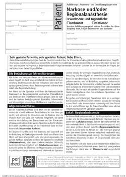 Hier beispielhaft abgebildet: Der Aufklärungs-, Anamnese- und Einwilligungsbogen einer Narkose und / oder Regionalanästhesie für Erwachsene und Jugendliche, der perimed Fachbuch Verlag Dr. med. Straube GmbH, Böhmlach 77, D-91058 Erlangen